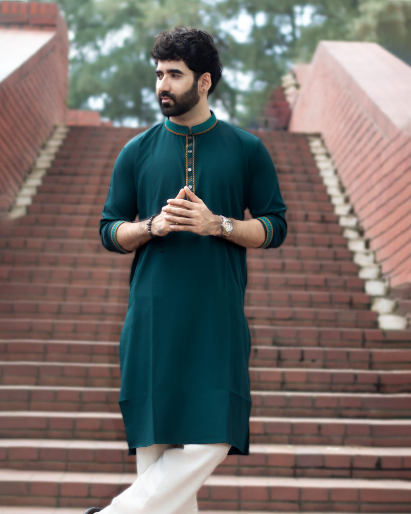 বোটল গ্রিন কালার মাইক্রোস্টিজ এমব্রয়ডারি লাক্সারি পাঞ্জাবি