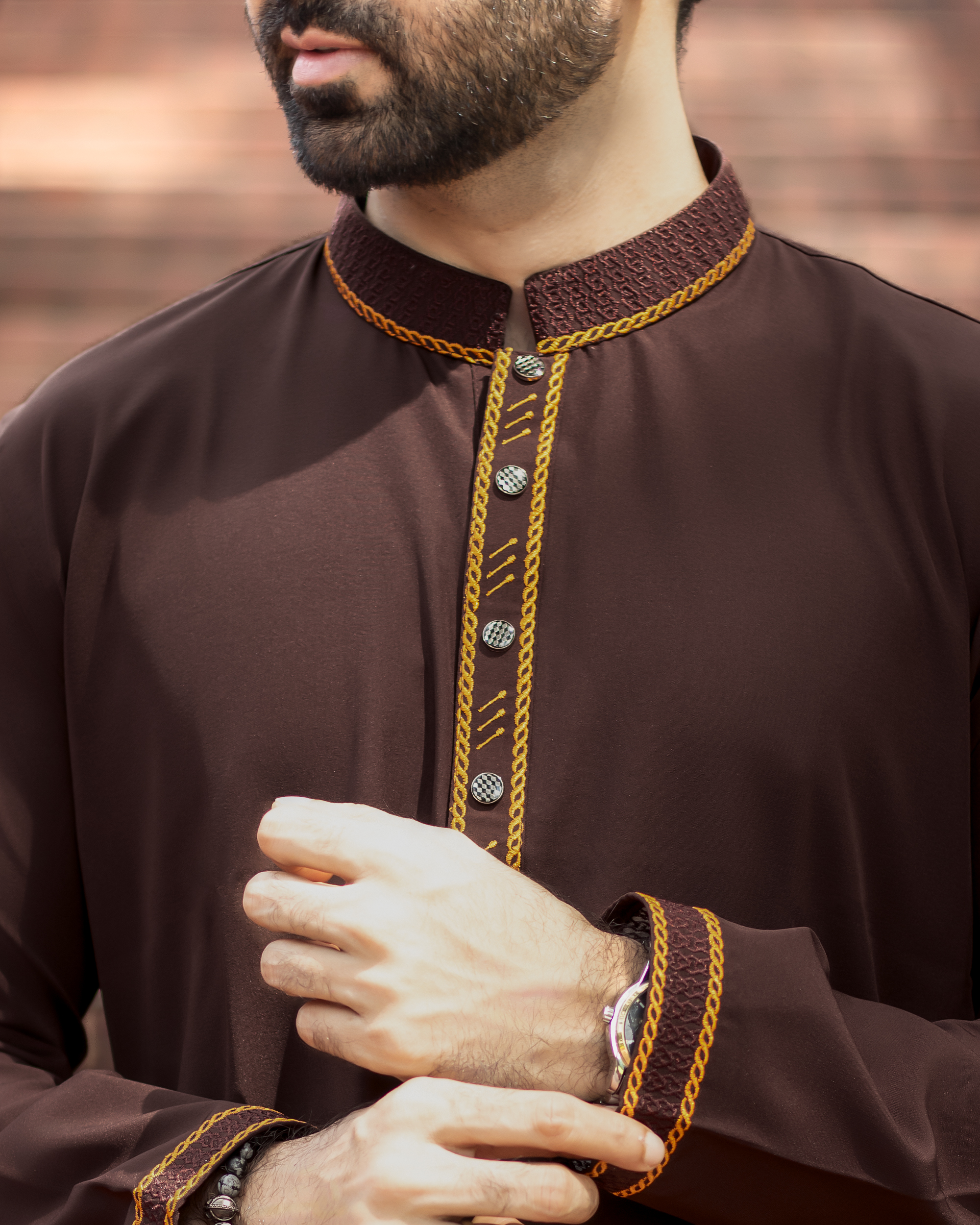 কফি কালার মাইক্রোস্টিজ এমব্রয়ডারি লাক্সারি পাঞ্জাবি